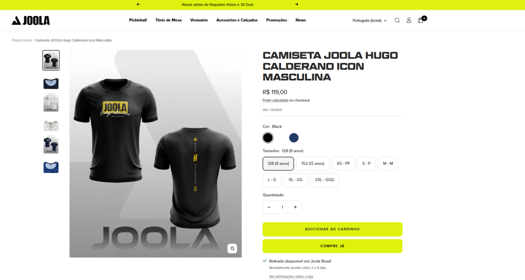 A parceria não ficou apenas no anúncio institucional. Poucas horas após a confirmação, o site da JOOLA Brasil passou a exibir uma seção específica com o nome de Hugo na parte de vestuário, incluindo a “Camiseta JOOLA Hugo Calderano Icon” em versões masculina e feminina, com diferentes cores e tamanhos.